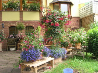 Auf Hof und Terrasse sind mehrere Sitzgelegenheiten, die von Kübelpflanzen und Ampeln umgeben sind (Foto oben).