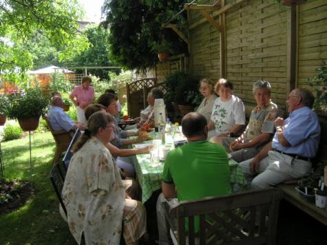 Sitzgelegenheiten sind in jedem Bereich vorhanden, wie auf unterem Foto beim Fuchsienstammtisch der Fuchsienfreunde Saar-Pfalz Mitte Juni 2006 zu sehen ist (hier unterm Walnussbaum).
