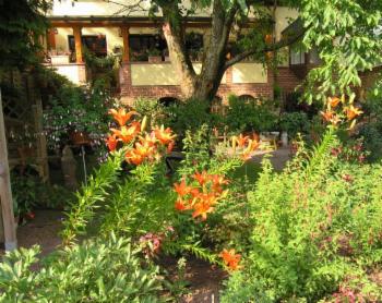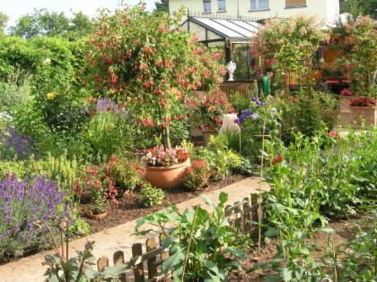 Auf dem Foto sind im Vordergrund die heranwachsenden Dahlien zu sehen, die im Spätsommer und Herbst mit den Fuchsien harmonieren.